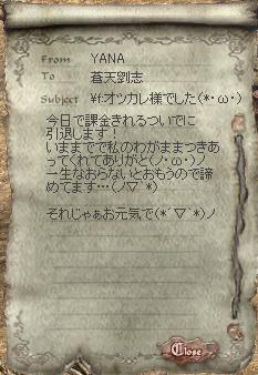 なんでも課金ついでに引退らしいです。 YANAとはあんまり歴史も深くないですし、 お互いわかるほど狩りした仲でもないので、 思い出すのは、最初に出会った時と 一緒に狩りしたことかな? 最初に出会ったのはHC2F。 クラ茶で狩場を話してると、どうやらこっちに向かって 来てる様子。ワサワサ敵にBOX食らいながら狩ってる と、なぜかヒールされている。辺りに人がいないので 「画面外かな?」っと思ってたけどディティク!(´ι _` ) そこに現れたのがYANA。未変身♀WIZだったので タゲられてるのを守ろうと頑張ったのが間違い。 だって・・・DK WIZなんですもん つД`)・゜・。・゜゜・*:.。 「思ったより普通の狩りだったw」って言われたのが 印象的でしたw STR WIZにどんなイメージが?w お疲れやま~ また遊びにきたとき狩りいこーw 。゜(゜´Д`゜)゜。 YANAの仮引退ってことでw 追悼OEしたらなんか出来そうだったので OEしました。 ふぃふぃわらしべの秘儀 最高速OE 『流らOE』で!! 走りOE(ながらOE)・・・各自の持つ最大スピードを 維持しながらOEする手法。高速での移動により確変現象を誘発し、 OE確率を上昇させる効果があるというソアラ様論 ぶぅぅぅぅ~~~~んんんん ε≡≡ヘ( ´∀`)ノ PR